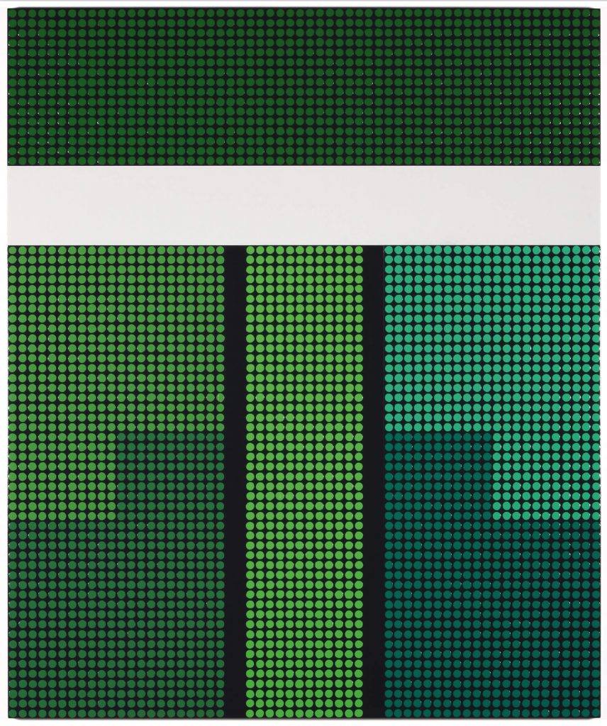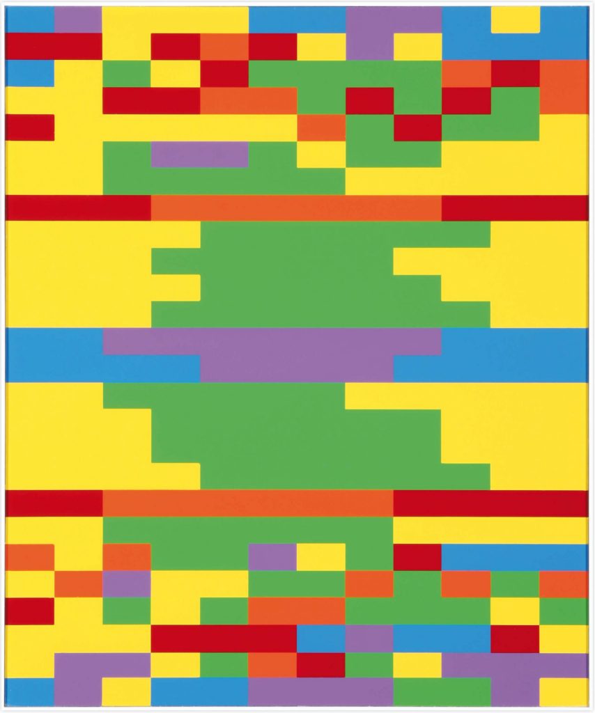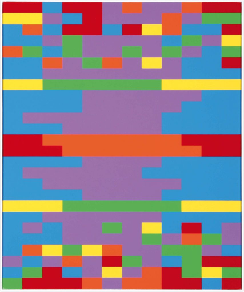 Die einzelnen Module erinnern an digitale Pixel, entfalten jedoch durch ihre malerische Präsenz eine eigene Materialität. Aus der Nähe erscheint die Komposition als Abfolge klar abgegrenzter Farbflächen, aus der Distanz hingegen verdichten sich die Felder zu Bildmotiven, die zwischen Abstraktion und Figuration oszillieren.