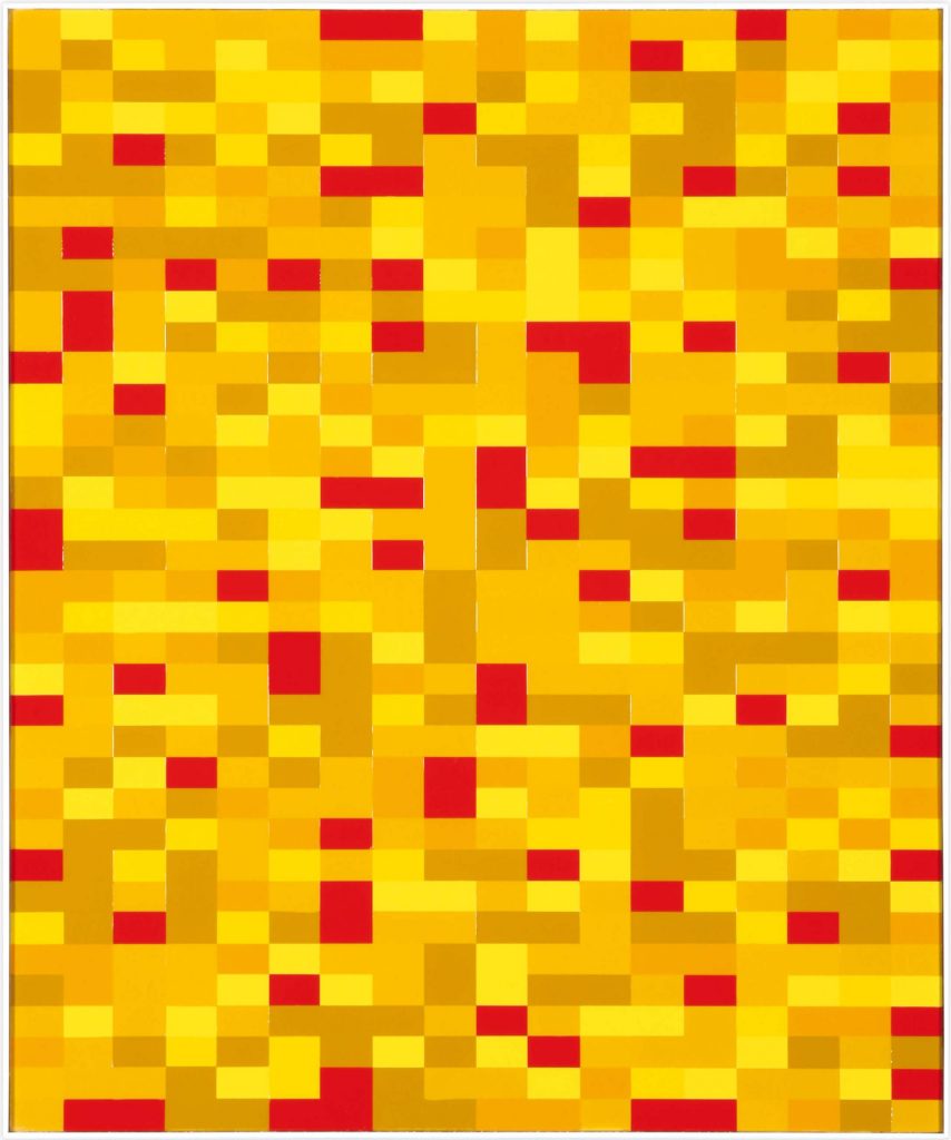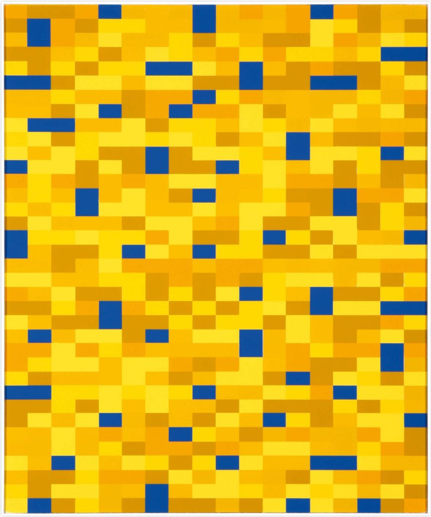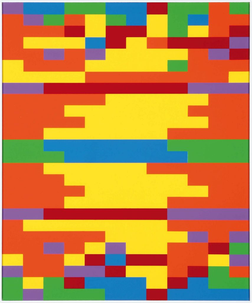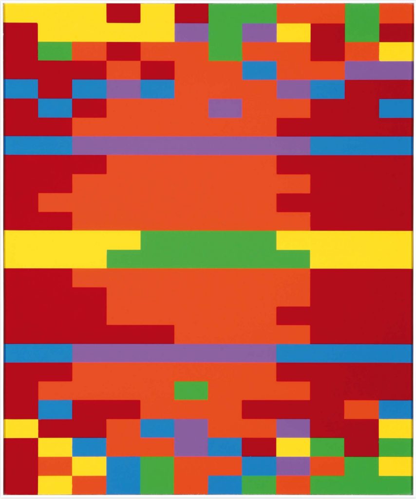 In der Serie „Pixel“ untersucht Max Mustermann die Wirkung kleinster Farbbausteine. Aus rechteckigen Feldern, die in strenger Ordnung angeordnet sind, entsteht durch gezielten Farbwechsel und Addition das Bildganze.