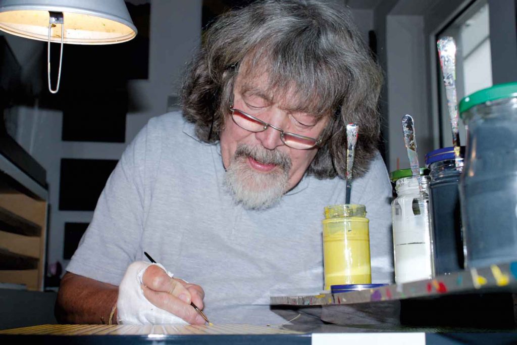Der viskose Lack fließt und umhüllt als dünner, farbiger Film den Untergrund. Damit eine nahezu plane Oberfläche entsteht, die dem Licht als Spiegel dient und so Hochglanz garantiert, ist ein besonders glatter Untergrund von Nöten. So verwendet Jürgen Krause Melamin beschichtete Holzplatten als Untergrund.