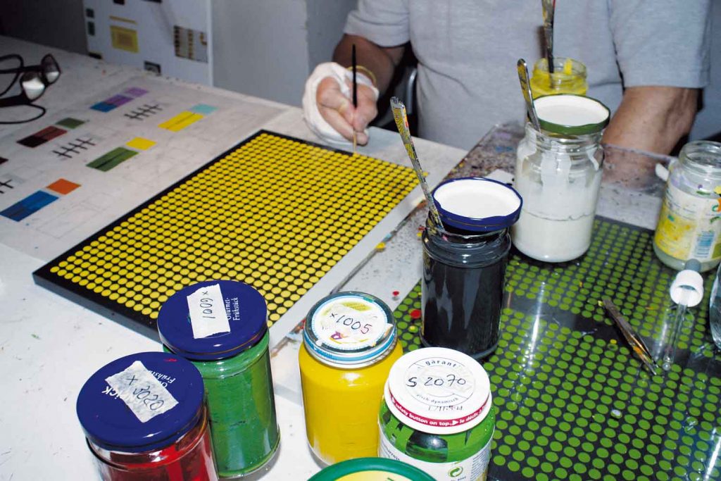 Die Arbeiten entstehen mit Hilfe von Folien, die anfangs die gesamte Bildfläche bedecken und dann nach und nach partiell abgenommen werden. So werden Farbe um Farbe Teile frei gelegt, die dann einzeln mit Lack gefüllt werden. Der Arbeitsgang, der zu den Bildern führt, ist langwierig und wird immer wieder unterbrochen durch lange Trockenphasen.